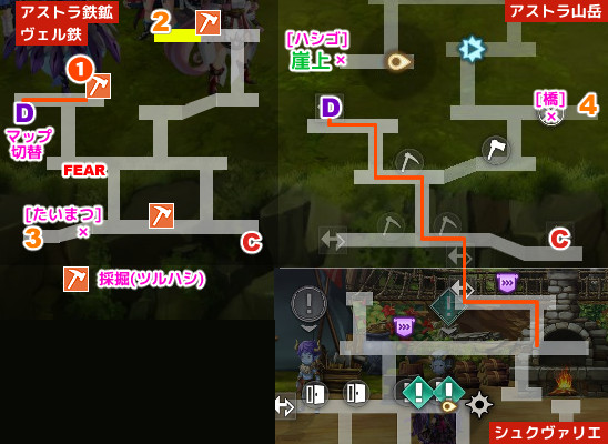 シュクヴァリエの北からアストラ山岳に出て左上の洞窟1で採掘PTに変更してアストラ鉄鉱15個(+Lv3分のヴェル鉄)を採掘。耐久度0になった場合は上部のツルハシアイコンをタップしてリペアキットで回復。耐久度0になった時点でヴェル鉄が50個確保出来たらツルハシをLv2から3して全回復するのがお勧め。