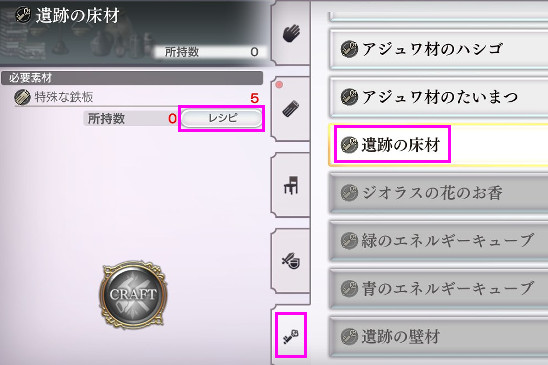 遺跡の床材を選択して特殊な鉄板の[レシピ]を表示、アストラ鉄鉱15個(3×5)で特殊な鉄板を必要数と同数の5個作り、前の画面に戻って遺跡の床材をクラフト。