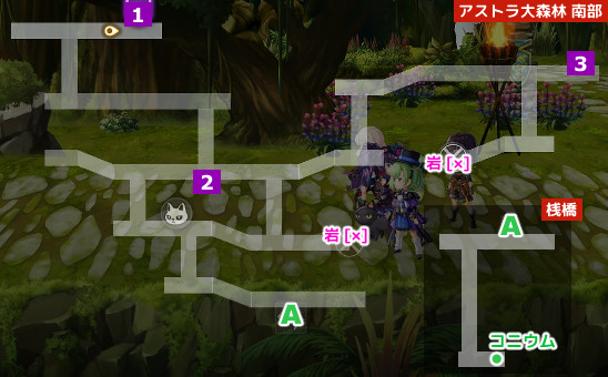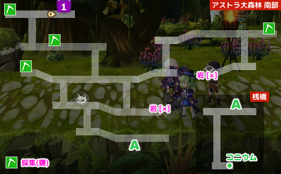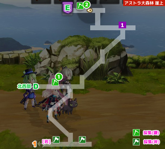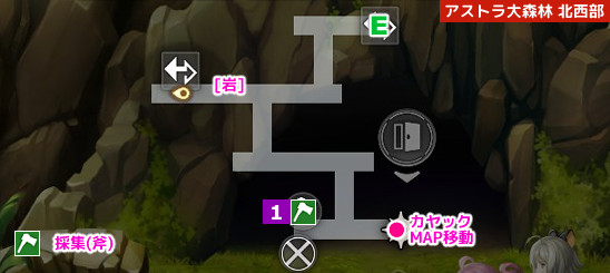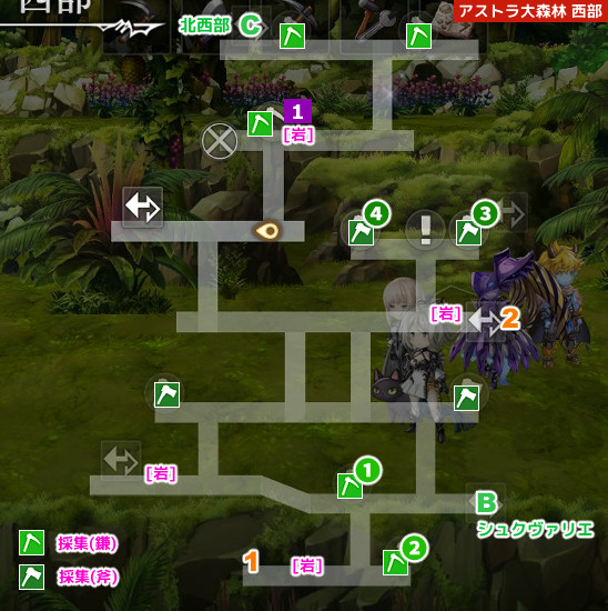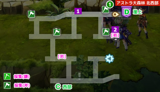 中央上1で岩をタップしてツルハシを使う(岩の撤去には耐久度を消費しない)。左上[C]から大森林北西部へ。