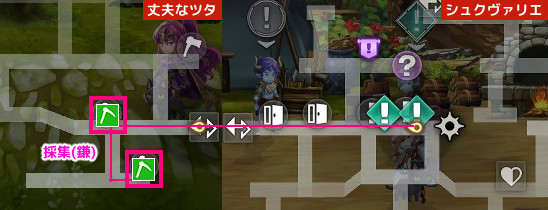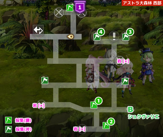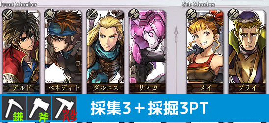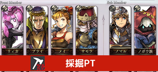 したがって基本的には採集・採掘ポイントまではザコ敵を倒せる攻略PTで移動し、ポイントに着いたら採集や採掘PTに切り替えてタップ連打、採取できなくなったらマップを切り替えて復活させるという流れになる。面倒な場合は採集・採掘PTでも道中の敵を倒せるレベルまで難易度を下げたりたり、採集・採掘PTにワンパン火力キャラを入れたり、敵出現頻度DOWN装備や雲隠れ鉱石を錬成したグラスタを3つ装備させて戦闘はすべて逃げるという手段もある。