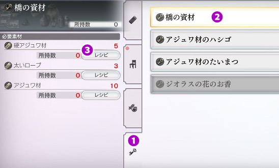 今回はキーアイテムの橋の資材を作成したいので一番下の1キーアイテムタブから2橋の資材を選択。そうすると左に必要素材が表示されるのでその3レシピをタップ。
