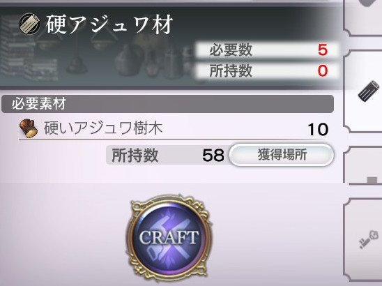 アジュワ材は[レシピ]→アジュワ材の所持数が10になるまでクラフト。