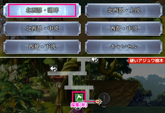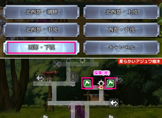 キラキラがなくなったら右のカヤックでマップ切替をする。[西部・中流]に移動し、すぐそばの船着き場をタップして[北西部・湖畔]に戻る。採集PTで1のキラキラがなくなるまでタップ連打。なくなったら再度カヤックでマップ切替をしてもう一度1をタップ連打する。