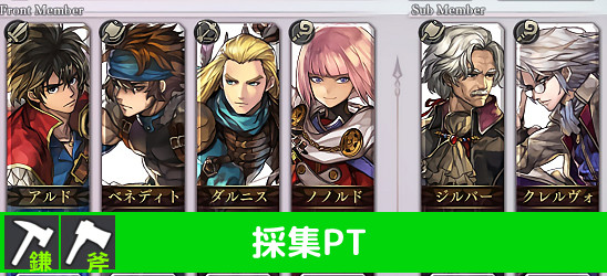 ストーリーをクリアするだけならそこまで徹底したPT編成をする必要もないので編成枠を削りたくないなら、採集と採掘を3人ずつ入れたPTを1つだけ作って移動戦闘用メインPTと切り替えて進めてもいい。あるいは採集6人PTで必要な採集素材を一気に集めて一通り集め終わったら採集PTを採掘PTと総入れ替えしてもいい。