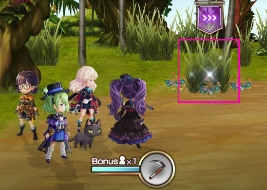 採集・採掘はマップ上にあるキラキラの部分を直接タップして行う。キラキラの場所はマップ上に鎌・斧・ツルハシのアイコンで表示される。Bonusx1は対象の採取場所に対応する採集・採掘キャラを何人編成しているかを示している。上の画像の場合は草(鎌)に対応した採集キャラを1人編成している状態を表している。