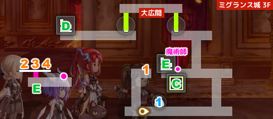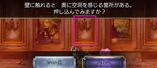 [E]の階段を上った先にある絵画の間にある壁●に触れて押し込むと左の宝箱[234]のある隠し部屋に入れる。
