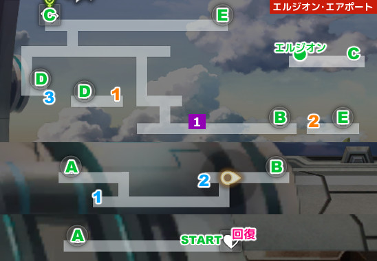 マップ下の回復ポイントから開始。[A]→[B]→1でイベント戦闘。左上[C]からエルジオンへ。