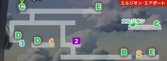 シータ区画:中央上の家1でイベント。パーティーにエイミを入れた状態で話しかけるとキャラクタークエスト『我が母の教え給いし唄は』開始。家を出て下にある[!]案内板マップでエルジオン・エアポート[C]に移動。右下の2でイベント。