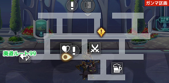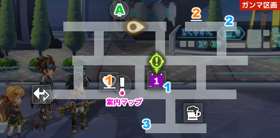 ガンマ区画:中央の鍛冶屋1でイベント。鍛冶屋を出てすぐ左にある[!]案内板マップでシータ区画ゼノ・プリズマ前に移動。