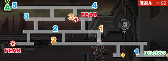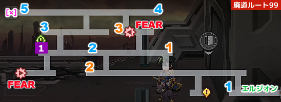 廃道ルート99:1でイベント戦闘。その後、MAP移動でエルジオンへ。