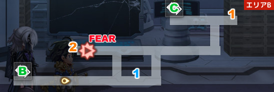 エリアB:[C]へ。宝[2]はFEARを右側までおびき出して下から回り込めば倒さなくても取れる。戻るときに戦闘が避けられない場合は戦闘中に逃げるかマップ移動で廃墟に入り直せばいい。