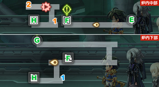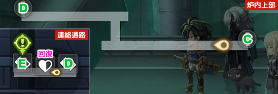 炉内上部:[D]から[E]へ。連絡通路では何度でも回復可能。マップ移動で直接連絡通路に移動できるようになる。