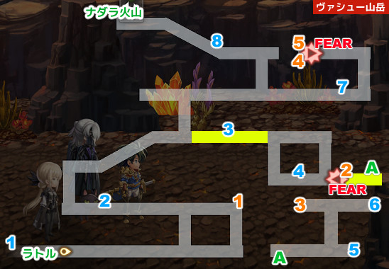 ヴァシュー山岳:上のナダラ火山へ。[A]の手前にいるFEARは左側からおびき出して上から回り込めば倒さずに通れる。ただし帰りは完全に塞がれるのでMAP移動でラトルからまた入り直すのもあり。
