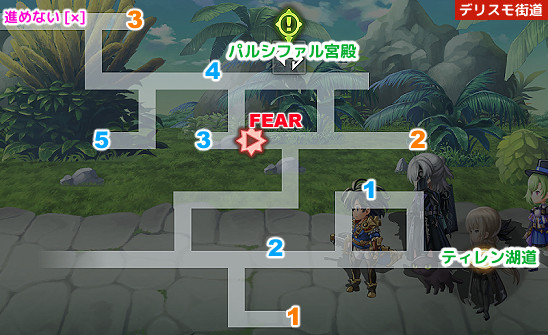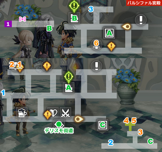 パルシファル宮殿[A]から[B]に進んで1でイベント後、8章クリア。9章クリアまでマップ移動が制限される。宝[4][5]は蒸気が出てる通気口をタップすると中に入れる。牢屋内の宝は現時点では取れない。