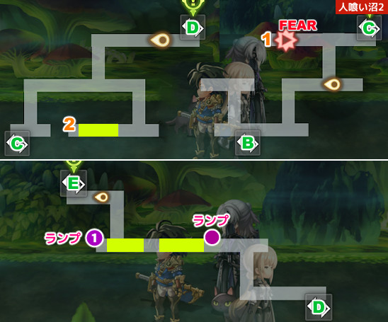 人喰い沼2:右上[C]から[D]へ。[E]への道は1のランプに火を灯すことで通行できる。
